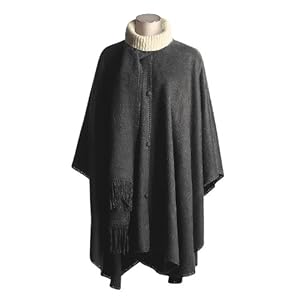 A vision of elegance and cozy warmth, this cape and elegant cloak is the epitome of Peruvian chic. One great classic design this piece based upon the traditional cloak of the Andean highlands. The cloak features a delicate crocheted border finished by hand. A matching scarf that flows gracefully from the back of the collar. is sewn to the cloak, which fastens with four ornate buttons. Very light and warm. 70% alpaca 30% acrylic.